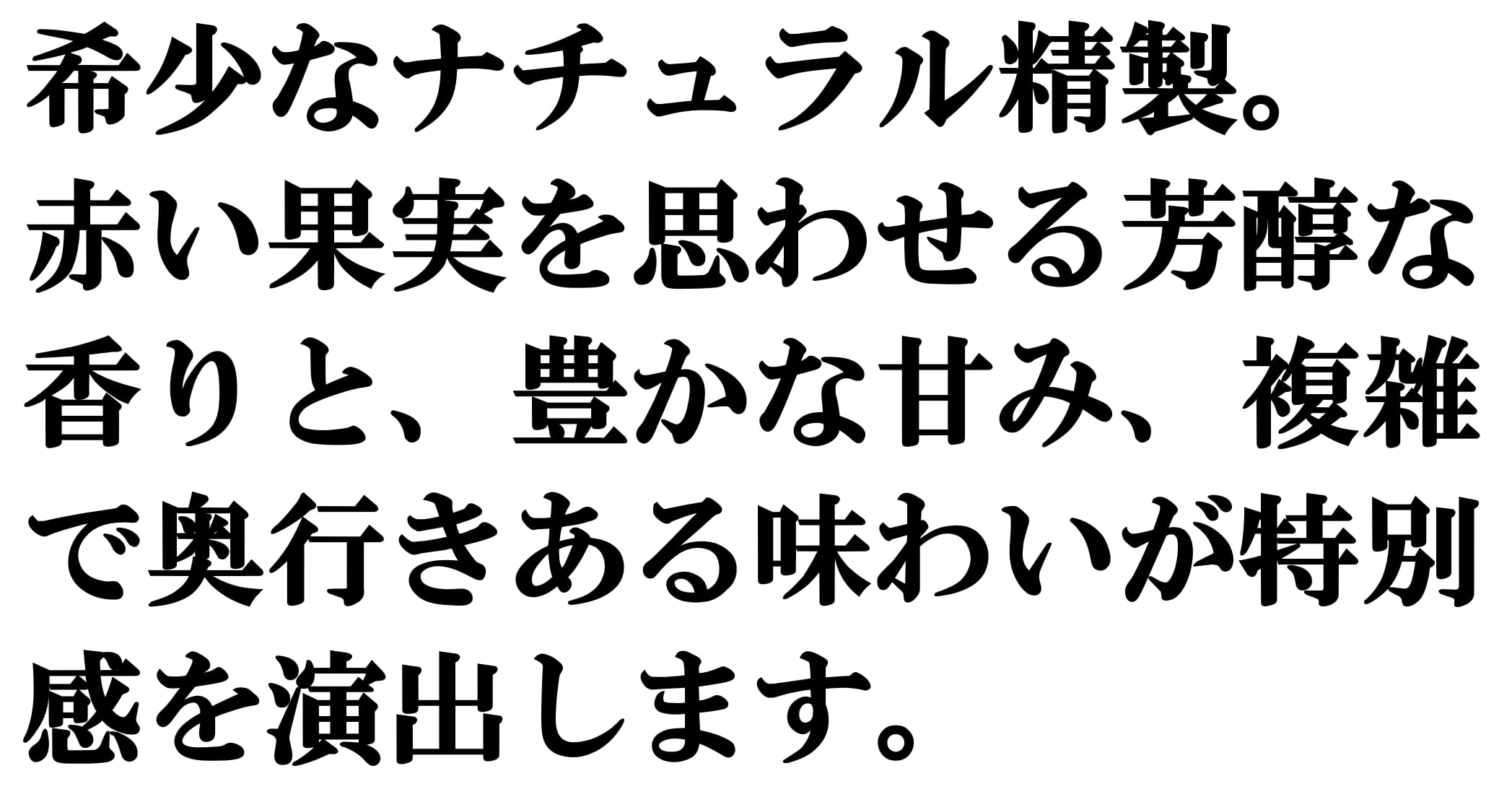 すべすべとした液質とともに、この重厚な熟成感と明瞭な酸味のバランスをお楽しみください。